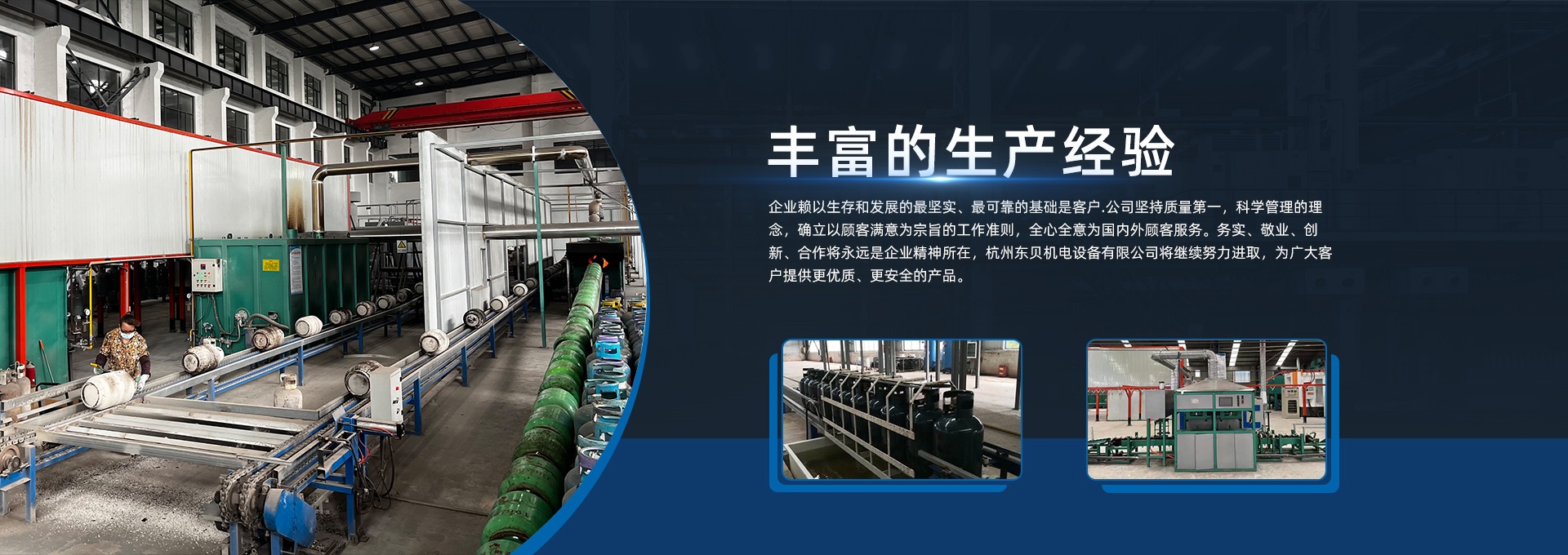 杭州东贝机电设备有限公司位于风光秀丽的江南水乡:杭州市余杭区仁和街道大运河经济开发区,紧靠杭宁高速,沪杭高速,104国道,京杭大运河,水陆交通十分便利,地理位置优越。公司生产区设在杭州市余杭区仁和街道大运河经济开发区,公司生产区占地面积8000m2,建筑面积3000m2。公司拥有主要生产设备50多台(套),现有员工53人,技术人员15人,其中5人组成的技术专家组成员都是在行业内工作几十年的专家。公司是国内具有大规模专业生产各类气瓶充装、清理、检测、输送、涂装设备的企业。公司主营气瓶检测线、气瓶检测设备、钢瓶检测设备、无缝气瓶检验设备、液化气钢瓶检验设备、溶解乙炔气瓶检验设备、低温绝热气瓶检验设备等。产品畅销浙江杭州、东北、西北等全国各地并出口全球。